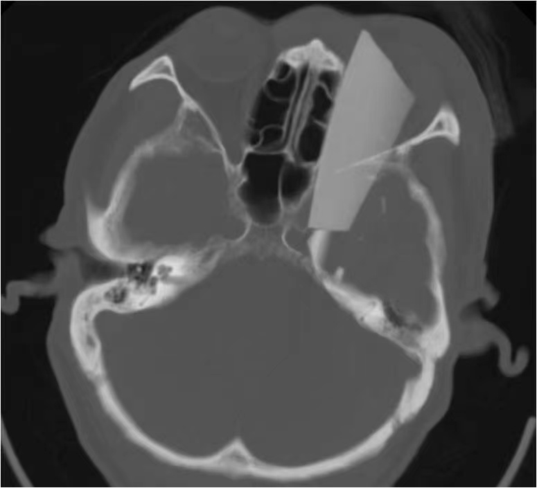 急诊医生首先接诊,在完成新冠病毒肺炎风险排查后,马上为患者安排了颅脑CT检查并请神经外科代从新医生紧急会诊。通过CT影像可见,一块长度超过10cm的玻璃碎片如利刃般自左侧眉弓处刺入眼眶,异物刺破眼眶进入颅内,尖端直抵脑干前方,左侧眼球破裂。更为棘手的是,异物因刺到颅底骨质,颅内玻璃碎为数块,并伴有颞叶脑内血肿形成。万幸的是就诊时患者神志尚清楚。