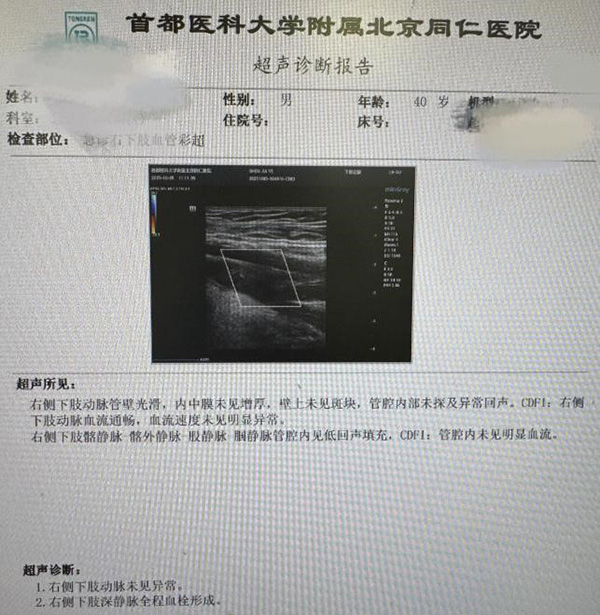 这位男性患者今年40岁,2月前做了右股骨粗隆间骨折手术,假期前发生右下肢肿胀,因骨折术后活动少未予重视,之后下肢肿胀加重,假期间到北京同仁医院就诊。我院急诊外科医生第一时间开具下肢血管彩超检查,结果提示,右下肢深静脉全程血栓形成(髂-股-腘静脉)。